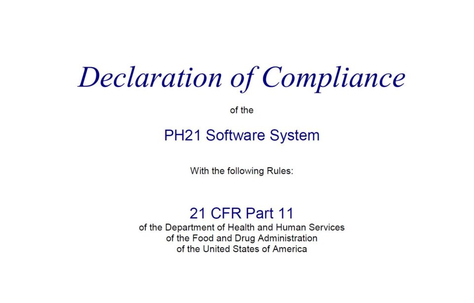 The Ph21 software fully complies with FDA regulation 21 CFR Part11 and the European Regulations for software applications in GMP-critical environments within the pharmaceutical industry.