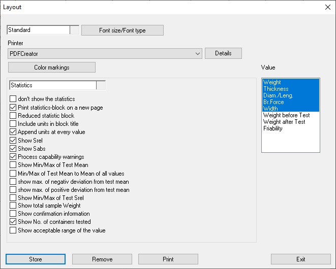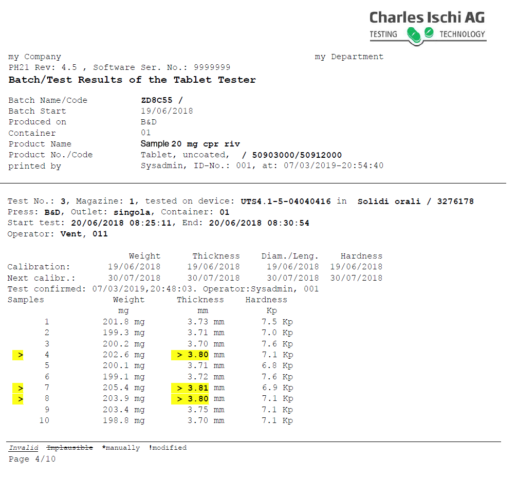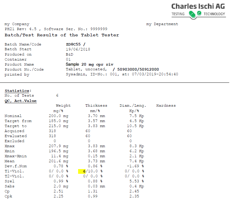 All alarms can be configured to release predefined actions (e.g. light a yellow or red lamp, stop the tablet press etc.). A quality control chart may be shown which is automatically updated after every test.